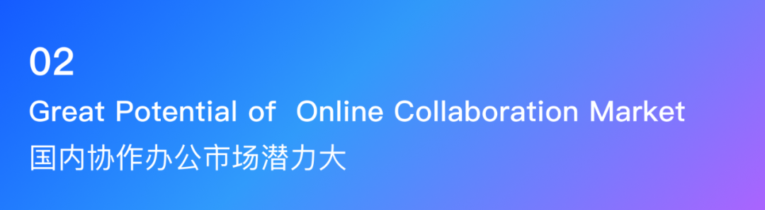 2020年开始中国协同办公市场规模达到440亿元,疫情带来了大量的新用户,使得市场规模增速显著提升,同比增长率为43.5%。疫情过后企业远程办公需求减弱,预计市场增速将有所回落,2021 年市场规模将突破500亿元,增速略高于疫情之前。